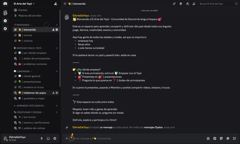 Únete a nuestra comunidad hispanohablante en Discord, un espacio para aprender a jugar al yoyó, hacer preguntas, compartir tu progreso y estar al día de todo lo que ocurre en el mundo del yoyó.